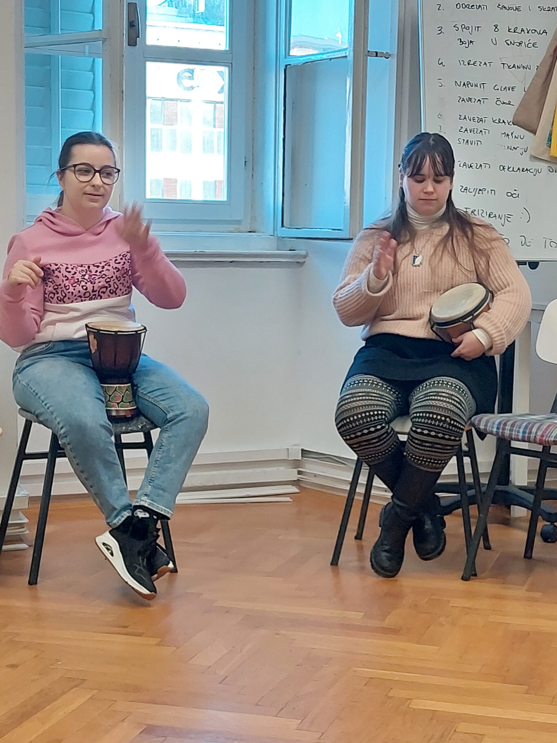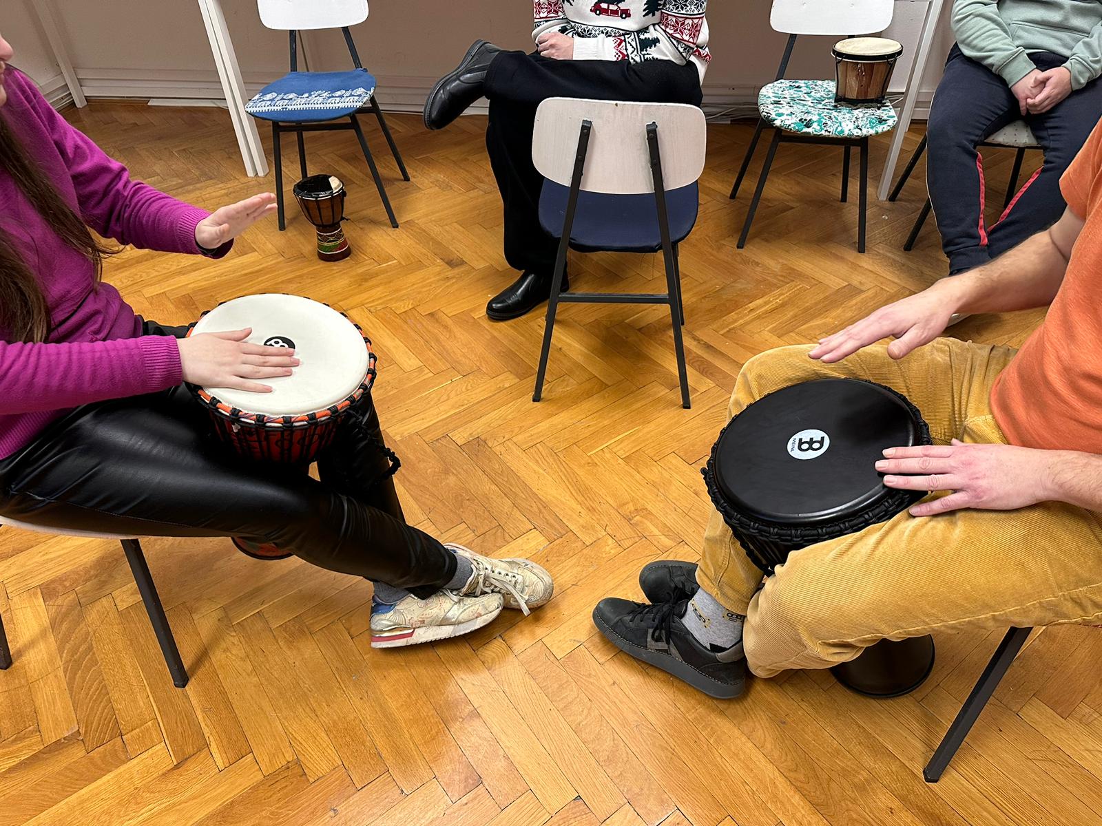 Kroz kreativnu improvizaciju korisnik ima priliku izraziti osjećaje koje teško verbalizira, razvija senzomotoričke vještine, jača pažnju, samodisciplinu i osjećaj pripadnosti grupi. Koriste se afrički bubnjevi, udaraljke i drugi perkusivni instrumenti.
