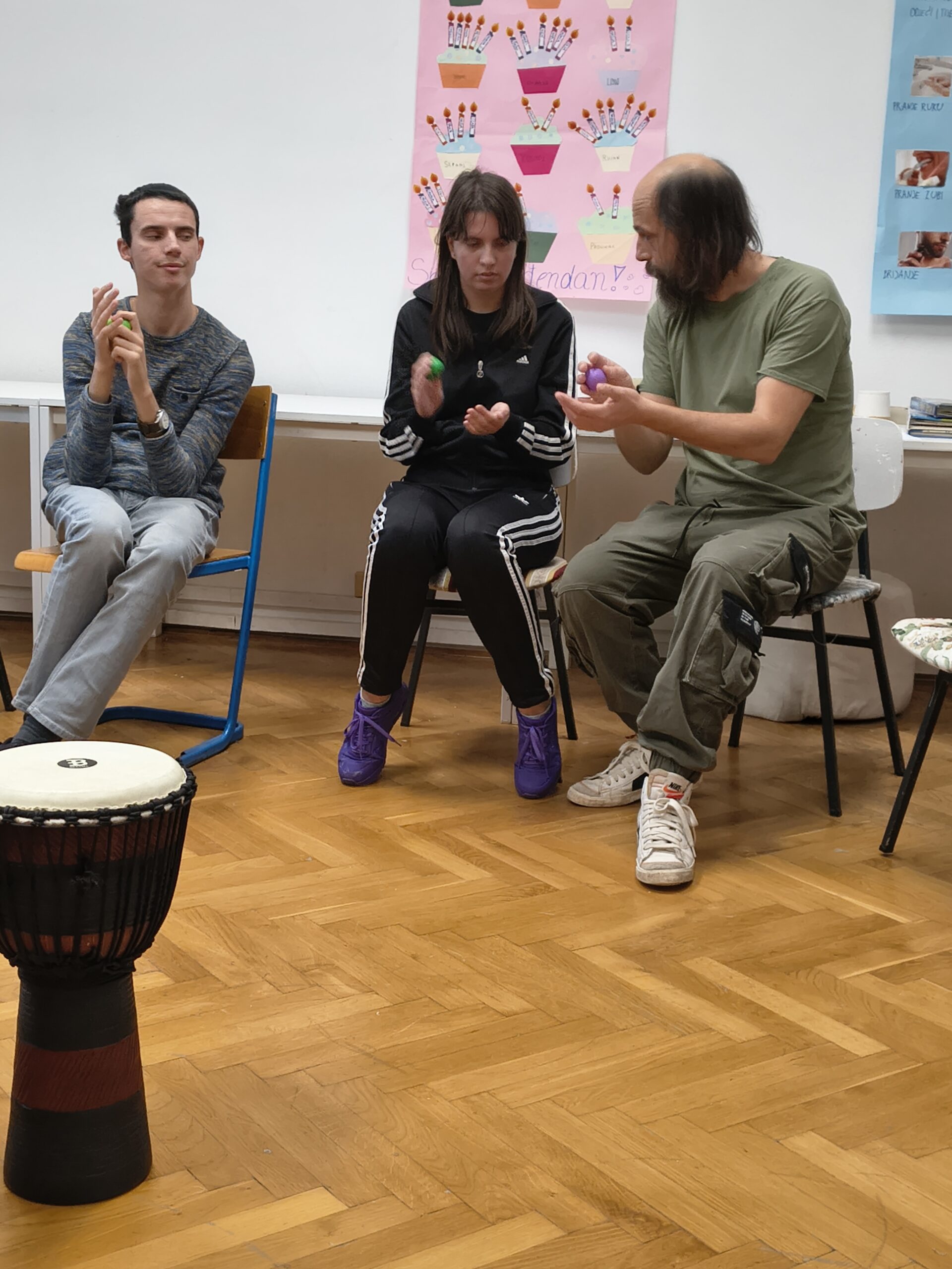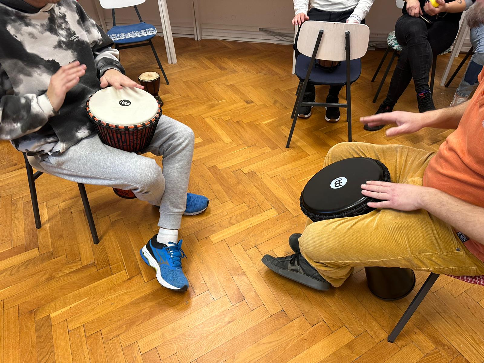 Glazbeno-terapijski rad uključuje elemente aktivne muzikoterapije, pri čemu korisnici stvaraju glazbu koristeći bubnjeve i udaraljke. Kroz improvizaciju korisnik razvija sposobnost spontanog izražavanja, jača osjećaj kontrole, potiče samopouzdanje i razvija kapacitete za suradnju u grupi. Utjecaj ritma na regulaciju živčanog sustava dobro je dokumentiran – ritmičke aktivnosti mogu smanjiti stres, regulirati puls, potaknuti motoričku koordinaciju i unaprijediti fokus pažnje.